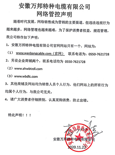 鄭重聲明:安徽萬邦特種電纜有限公司官方網站為:www_wanbangcable_com.ucdedu.cn,除此之外無任何子網站或合作網站,其余均為假冒偽劣。電話:0550-7621728 13485756353 地 址:安徽省天長市滁州高新技術產業開發區經四路29號